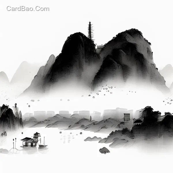 水墨山水风格的黑白色线条插图,融入中国风与国潮风格的配色,彰显中国元素韵味,白色背景,富有表现力