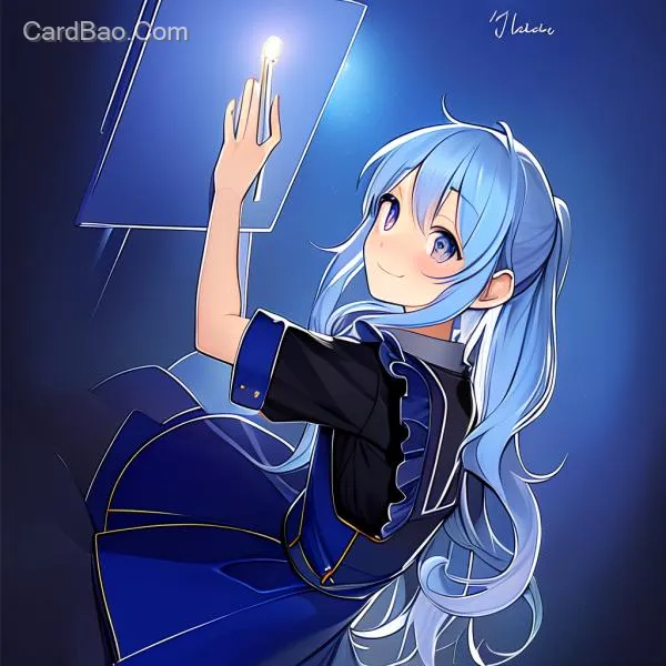 Manga style, a girl with big eyes, smiling shyly, long blue hair, wearing a fuchsia iridescent dress, drawing, micro details, exquisite, high definition, rendered.