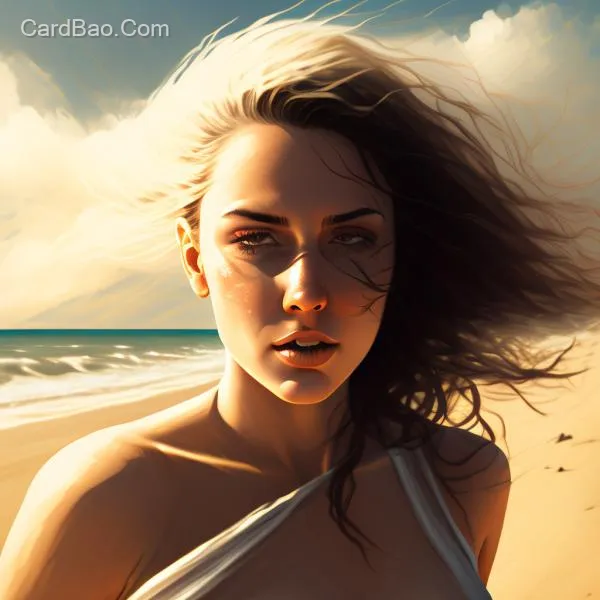 A beautiful woman is walking on the beach, with brilliant sunshine and a gentle breeze on a lovely day.