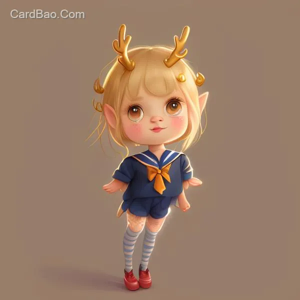 金色的鹿角,穿水手服的可爱小姑娘,精灵一样的耳朵,嘴巴张开,胸前是个蝴蝶结,光腿,膝盖一下是深色长袜子