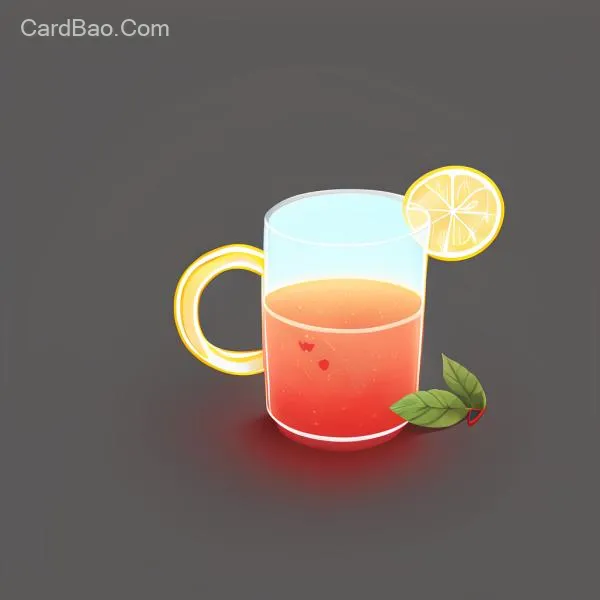 一个玻璃杯装着红色的果汁饮料,杯口有一片柠檬,杯子下面有两片叶子,玻璃杯是带手柄的