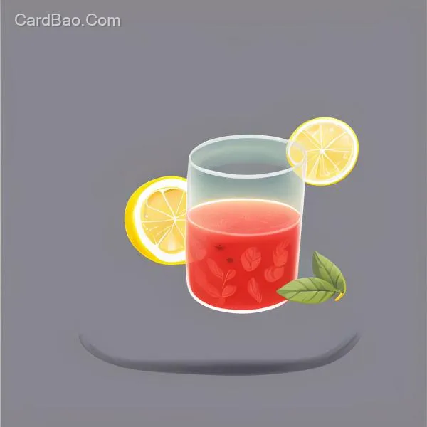 A glass is filled with red fruit juice, with a slice of lemon at the rim of the cup. Below the glass, there are two leaves, and on the left side is the handle of the cup.
