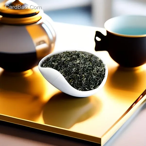 The background should feature lush, verdant tea mountains, with layers of tea plants creating a vibrant green landscape that showcases the growing environment of the tea leaves, hinting at their quality and origin.