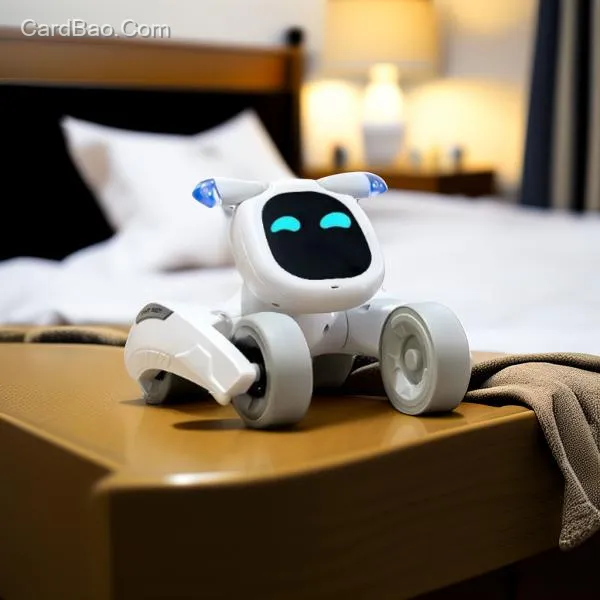 帮我生成一个温馨的卧室一角,一位宝宝正躺在床上休息,床前有一张小桌子,小桌子上摆放着这只智能机器狗