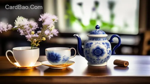茶壶放在一个胡桃木的茶桌上,配了四个小的青花瓷茶杯,光线从右侧照射进来