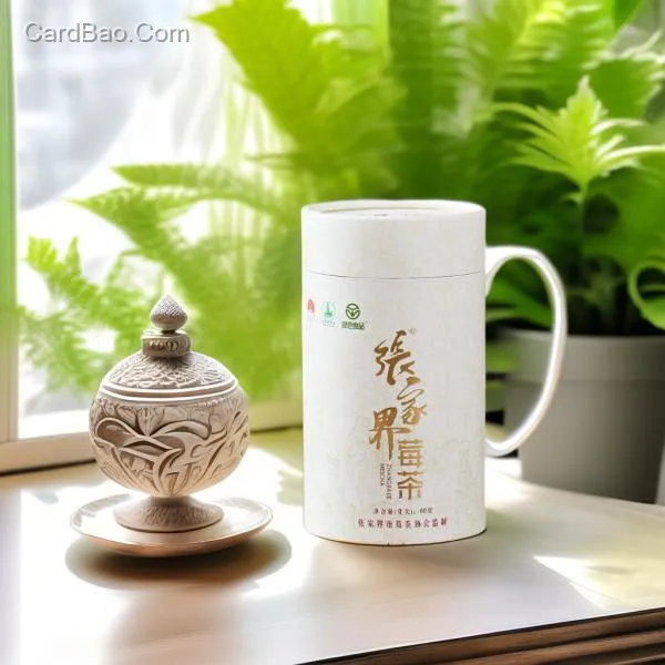 Indoor scene with gray walls and green plants, carved windows and tea sets, sunlight streaming in. A wooden table holds teacups, green plants, and a tablecloth. Delicately carved window grilles are on the right, while the left side is adorned with softly blurred green plants.