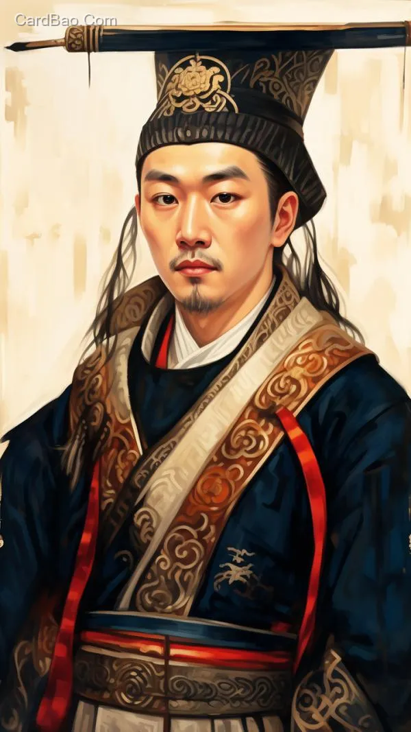 汉武帝,厚涂画法,五官精致,服装精美,表情严肃,