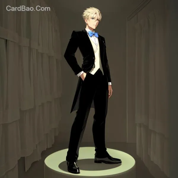 White bow tie, white vest, white shirt, blond hair with blue eyes, European youth, tailcoat, waist-to-hip ratio of 0.5.