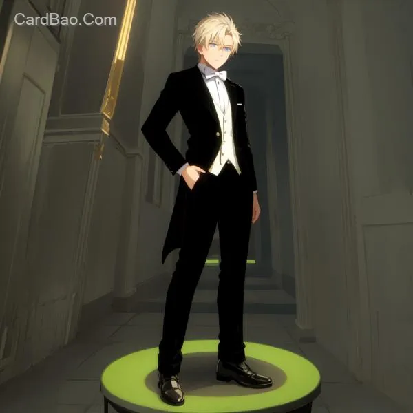 White bow tie, white vest, white shirt, blond hair and blue eyes, European youth, tailcoat, waist-to-hip ratio 0.5.