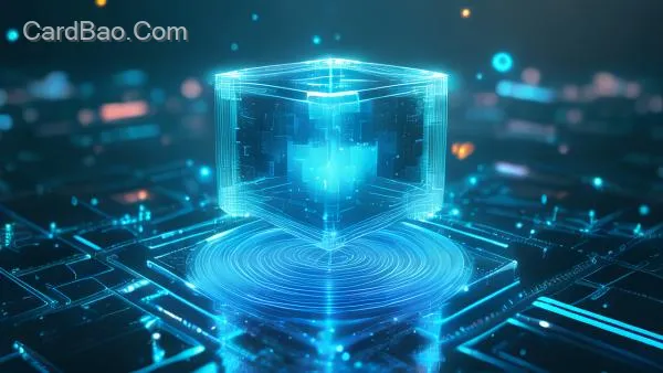Futurist abstract art, featuring a gradient cube at the center with a flowing, soft blue light effect on its surface. Inside the cube is a glowing energy core, surrounded by rotating, dynamically animated blue gradient ring structures. The base consists of a hexagonal platform, from which transparent blue data stream channels extend. The minimalist background is composed of geometric line patterns, with a cool color palette (primarily white and blue), and dramatic shadow effects from studio lighting.