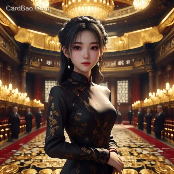 穿着旗袍的美女站在金币辉煌的大礼堂之中极具奢华,后面站着一群帅哥美女穿着黑色西装,表情严肃,8k,超写实,真实,美女穿着黑红色旗袍,身材出众,背景宏大,美女表情冷淡