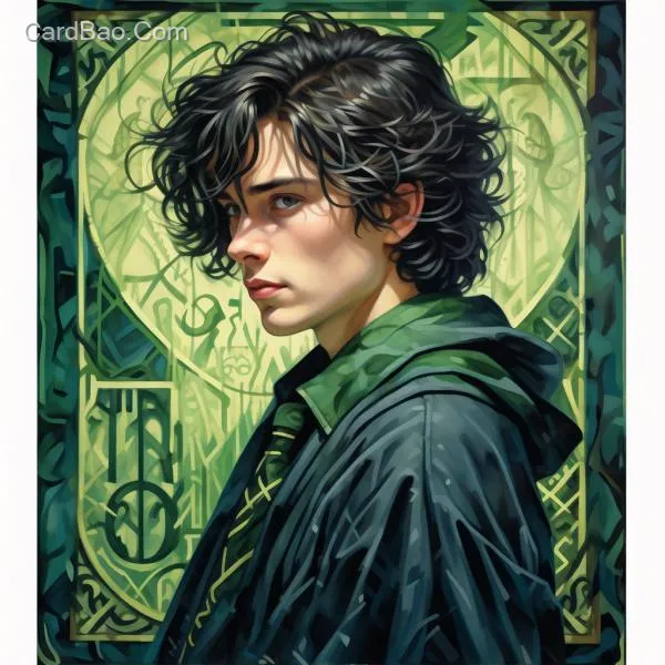 画面中的青年斯内普侧脸,有着深邃的眼眸,高挺的鼻梁下,薄唇微抿着,他的头发是标志性的黑色,微微凌乱在额前,更添几分不羁,身着黑色魔法袍,身姿挺拔,背景是斯莱特林蛇院标志,绿色底色