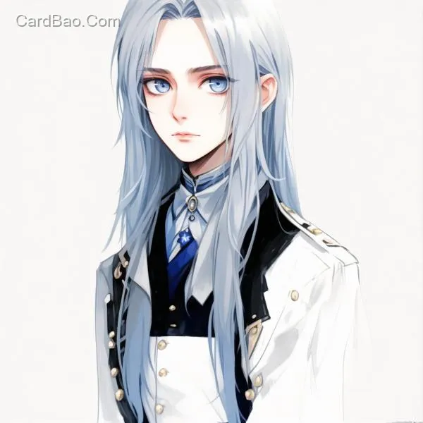 Draw a noble young man with blue eyes and silver, center-parted long hair in an elegant anime style. The setting is 19th-century Europe, and he is wearing a black military uniform with a serious and stern expression.