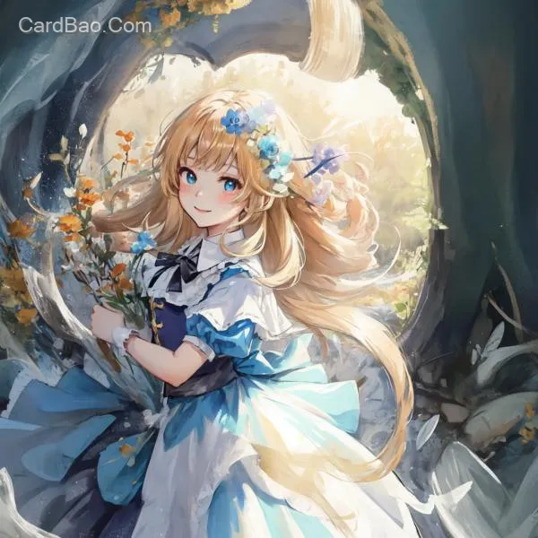 二次元,爱丽丝,金色头发,蓝色裙子,兔耳朵少女,爱丽丝梦游仙境,童话少女,特写镜头,上半身,鲜花环绕,少女,容貌秀丽,大脸庞,大眼睛,微笑,精致面容,梦幻修饰,色彩斑斓,虚幻引擎,CG原画
