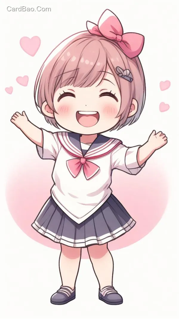 Chibi-style cartoon avatar, with bold line strokes, simple graphic features, and a cute appearance. The character is raising both hands holding a cheering banner, showing a happy expression. The character has short, adorable hair and is wearing a sailor-style school uniform with a short skirt.