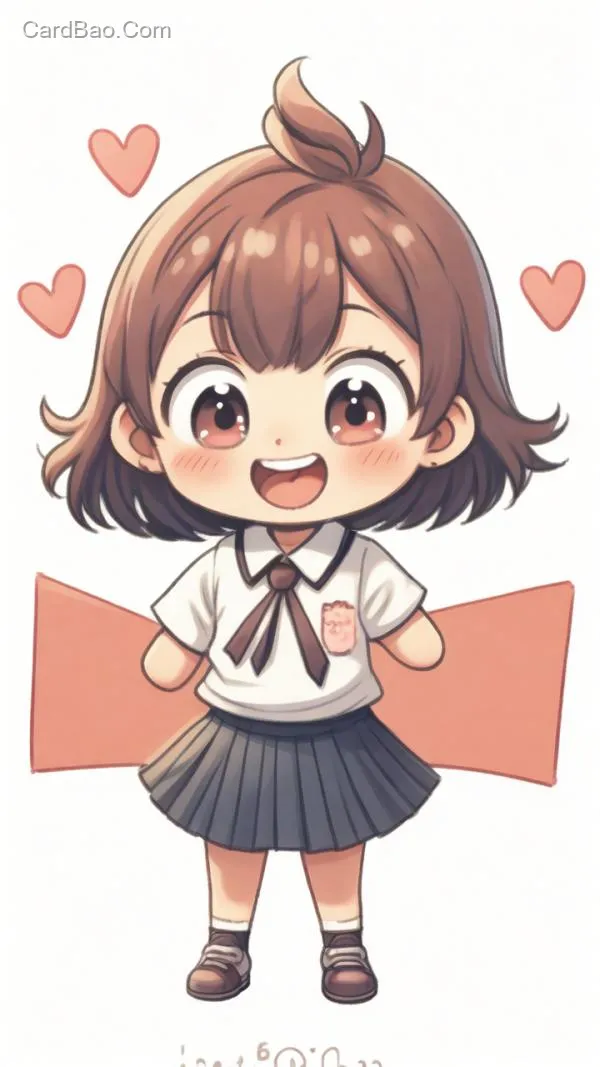 Q版卡通头像,粗线条笔触,简单的图形特征,可爱形象,双手举着应援手幅,面露开心,短发可爱,短裙校服