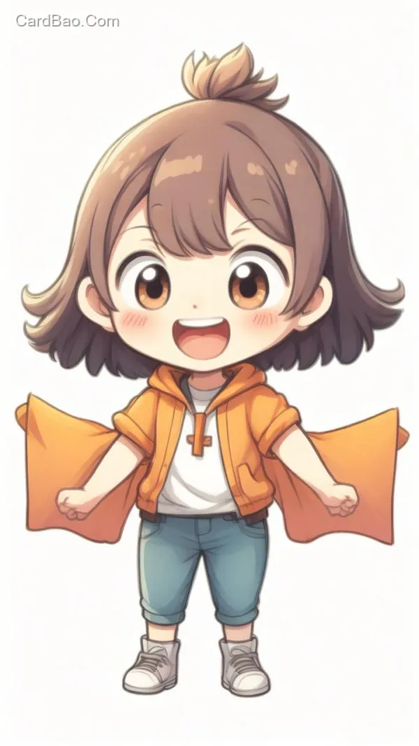 Chibi-style cartoon avatar, with thick line strokes, simple graphic features, and a cute appearance. The character is holding up a cheering banner with both hands, showing a happy expression, and has short, adorable hair.