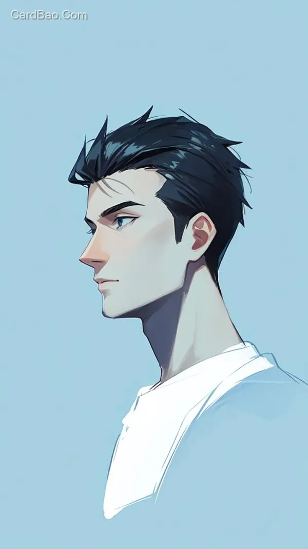Hand-drawn illustration style, minimalist, avatar, sapphire blue background, white silhouette of a person, cartoon, handsome guy's side profile, spiky short hair, line art