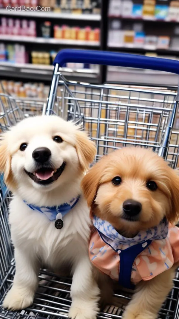 两只可爱害羞的小金毛犬坐在购物车上,兴奋的向主人发财