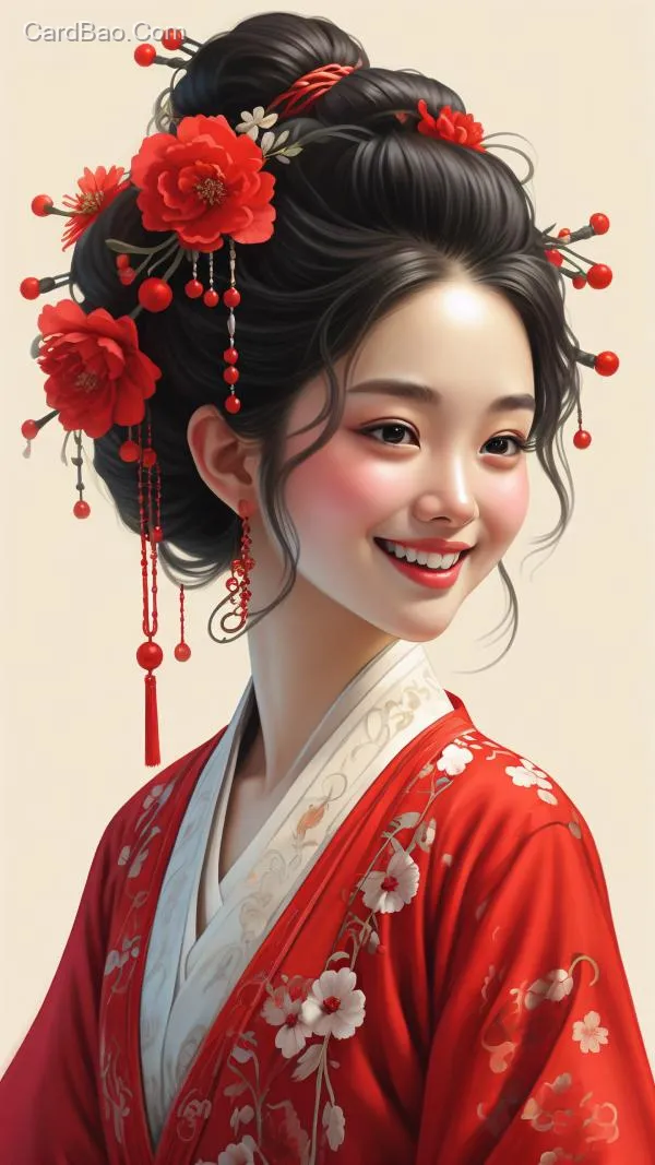Oriental beauty avatar, smiling, with a charm that outshines both past and present, adorned with peony makeup, wearing a red Hanfu, in a simple cartoon style.