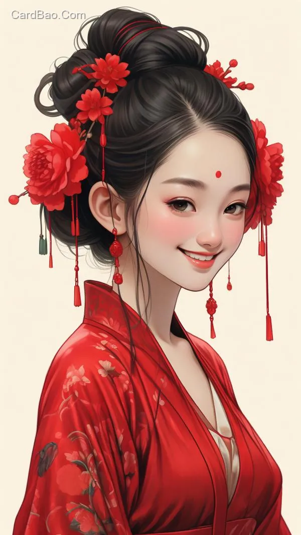 Oriental beauty avatar, smiling, with beauty that outshines the past and present, peony makeup, red Hanfu, minimalist cartoon style.