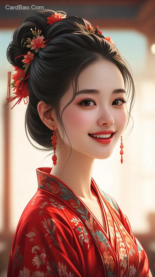 Oriental beauty avatar, smiling, elegance that outshines the past and present, peony makeup, red Hanfu, minimalist cartoon style.