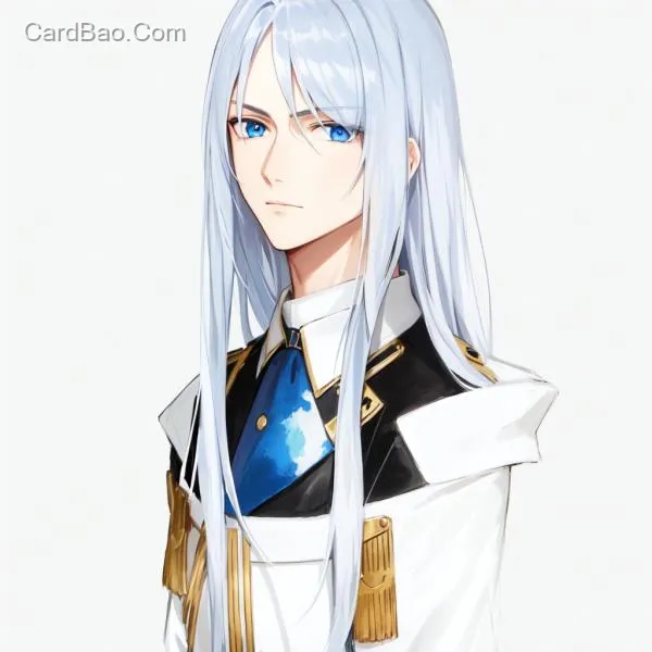 Draw a noble young man with blue eyes and silver, center-parted long hair in a beautiful anime style. The setting is 19th-century Europe, and he is wearing a black military uniform with a stern and serious expression.