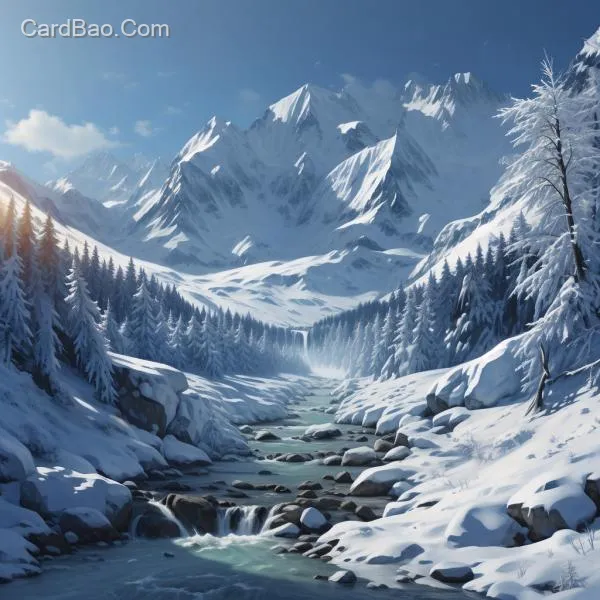 自然风光,雪山,河流瀑布,覆盖雪的山峰,蓝天白云,4K超清,真实主义,冷静,阳光,冷峻刚硬