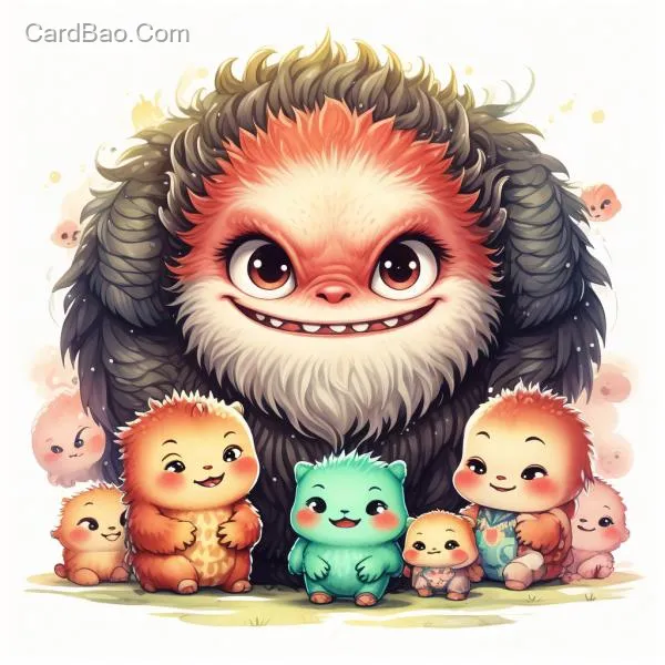 There are many of the big monster's little babies around it, in various colors, with expressions ranging from cute to calm.