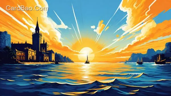 用波普艺术的风格,生成这张矢量图片:蓝色和金色为主色调,太阳照耀着海面。海里有透明的海洋生物。从海中央看岸上的视角,远处的岸边上高处有哥特式尖顶欧式建筑剪影。海占据画面的三分之一,沙滩占据画面三分之一。海面上有帆船。