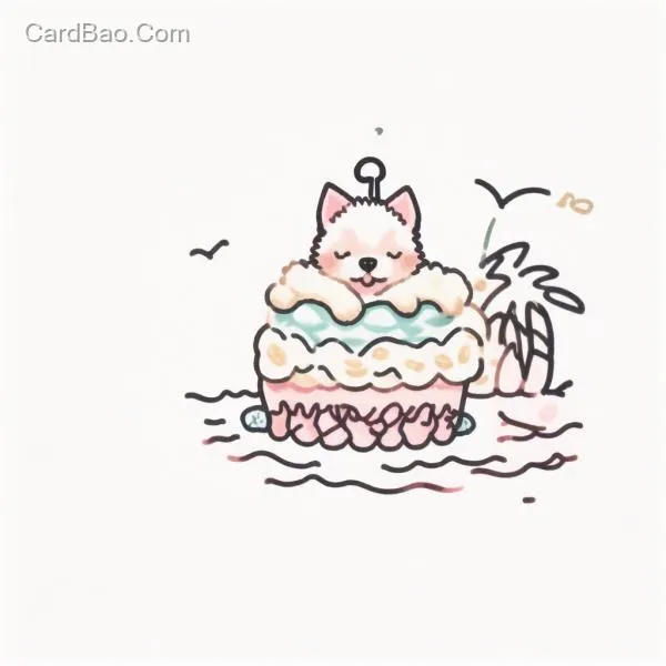卡通风格插画,一只可爱的博美犬坐在两层蛋糕上。底层是 8 寸,上层是 6 寸,小狗头上是一个五角星蜡烛,蛋糕装饰着粉色、蓝色和绿色的甜点,如冰淇淋、糖果和圆形装饰物。蛋糕周围装饰着花朵、叶子和小植物。背景是一个海滩景象,有一棵棕榈树、海浪和柔和的蓝色天空,天空中有星星和流星。整体色调柔和梦幻,以粉色、蓝色和绿色为主,营造出温馨且富有幻想气息的氛围,圆形 logo