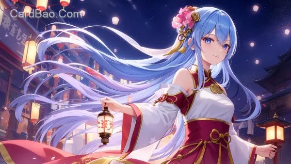 On a moonlit Lantern Festival night, a blue-haired girl smiles as she holds a bowl of steaming sweet rice dumplings. Her icy blue hair is adorned with a white jade hairpin, and her amber eyes reflect the glow of lanterns. She wears a vibrant red Hanfu embroidered with golden auspicious clouds, which flutters gently in the breeze. The background features ancient-style pavilions draped with carp-shaped lanterns, while the night sky is illuminated by fireworks and floating Kongming lanterns. Pink petals drift softly through the air. The scene is rendered in the style of Studio Ghibli blended with Makoto Shinkai’s signature lighting, presented in 8K ultra-high definition with silk-like textures and a mix of warm and cool glows.