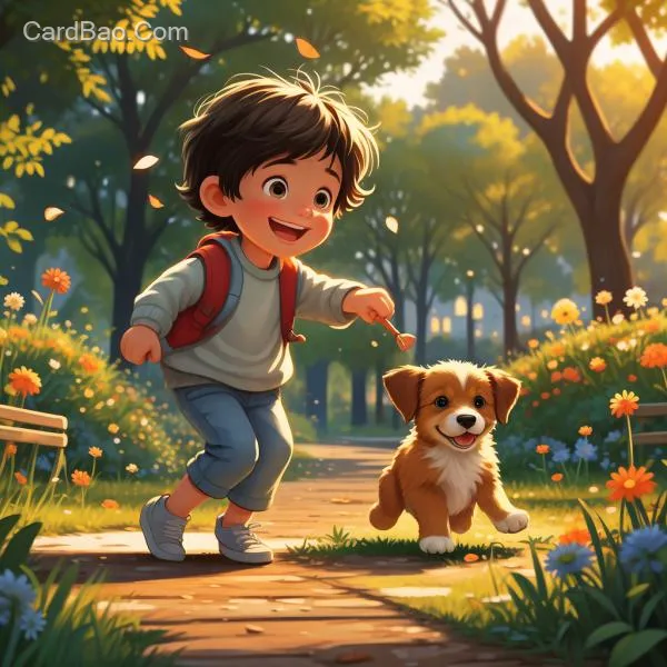 帮我生成一张图片:帮我生成一张10岁左右的小朋友和小狗在公园玩耍的图片。图片风格为卡通,比例1:1