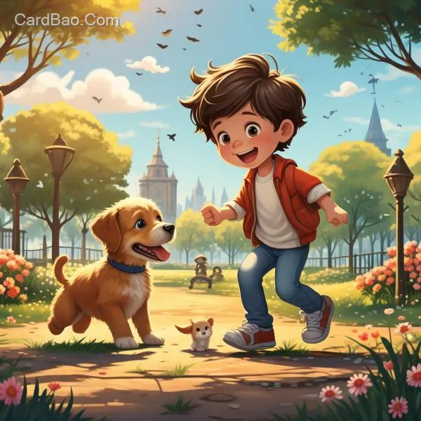 帮我生成一张图片:帮我生成一张10岁左右的小朋友和小狗在公园玩耍的图片。图片风格为卡通,比例1:1