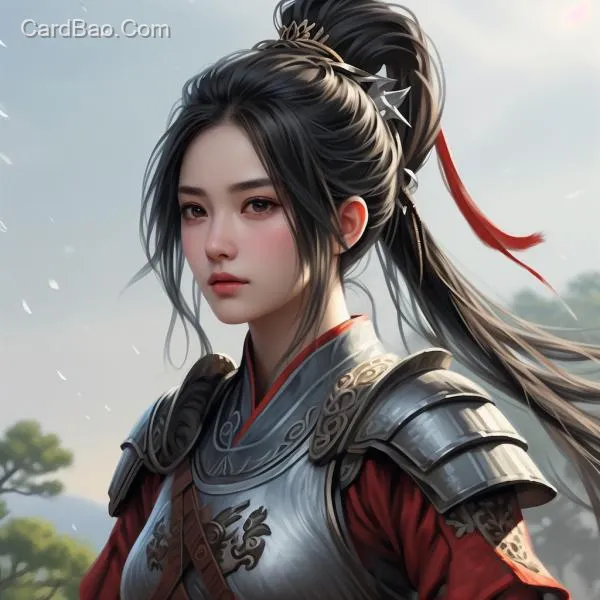 身穿铠甲的成熟女战士,黑发,棕色眼睛,高马尾