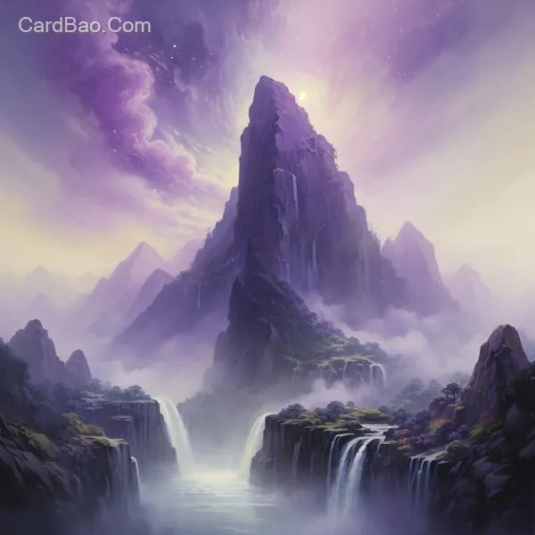 Amidst the mountains, there is a waterfall. The steep peaks, under the sunlight, give rise to purple mist and clouds. From a distance, the waterfall appears like a white silk ribbon hanging in front of the mountain.