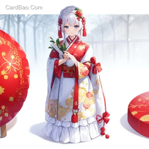 Draw the object from the reference image as a New Year greeting meme, holding a blank spring couplet in hand, with a festive New Year atmosphere. The object in the reference image is wearing New Year attire primarily in a bright red color.