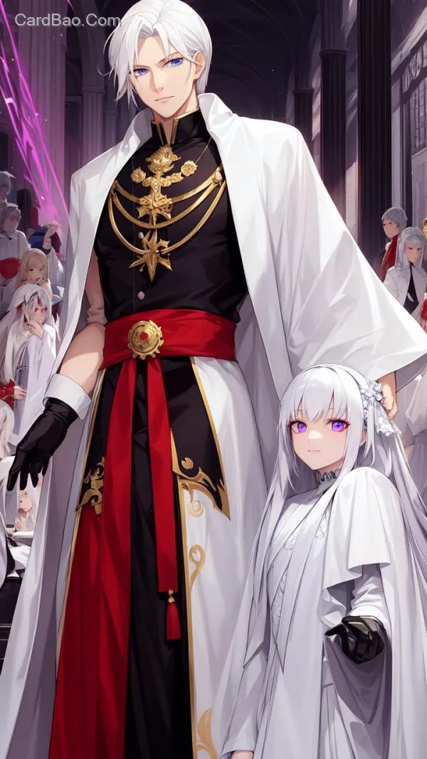 古风,大反派,白袍,金色头发,邪笑,18岁,右眼红色左眼蓝色,二次元,面容帅气,超级大长腿,大白腿,黑白丝,靴子,美少女,美女如云,好多美女在一起,开后宫,全身图,无男性,有女性,有很多女性