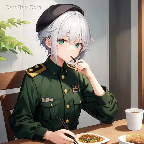 一位身穿绿色军装,有白色头发,梳着中分头的中年少妇,不戴帽子,头上架着一副深黑色的墨镜;有强烈的革命意志;坐在桌子前,吃着包子,手拿一双筷子;面容有些忧愁