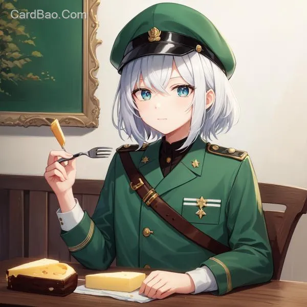 一个身穿绿色军装,有白色头发,梳着中分头的中年少妇,头上架着一副深黑色的墨镜,不戴帽子,有强烈的革命意志;坐在桌子前,吃着奶酪(奶酪上有一些蓝点),手拿一把小叉子,面容有些忧愁
