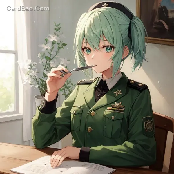 一个身穿绿色军装,白头发,梳着中分头的中年少妇,头上架着一副墨镜,不戴帽子,有强烈的革命意志;坐在桌子前,吃着有蓝点的奶酪,手拿一把小叉子