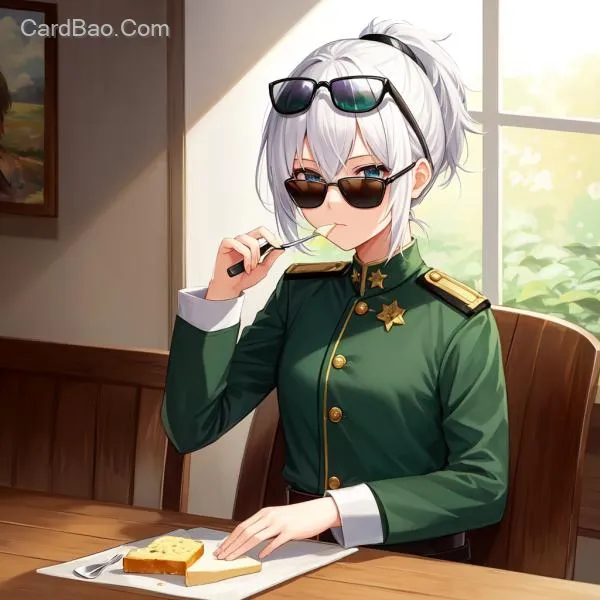 A middle-aged woman with white hair, wearing a green military uniform and sporting a center-parted hairstyle, has a pair of sunglasses perched on her head. She exudes a strong revolutionary spirit. She is seated at a table, eating cheese with a small fork in her hand.
