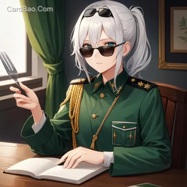 一个身穿绿色军装,白头发,梳着中分头的中年少妇,头上架着墨镜,有强烈的革命意志;坐在桌子前,左手拿着一把叉子,桌上放着一块蓝纹奶酪