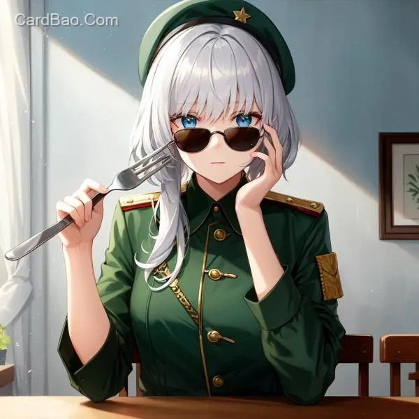 一个身穿绿色军装,白头发,梳着中分头的中年少妇,头上架着墨镜,有强烈的革命意志;坐在桌子前,左手拿着一块把叉子,桌上放着一块蓝纹奶酪