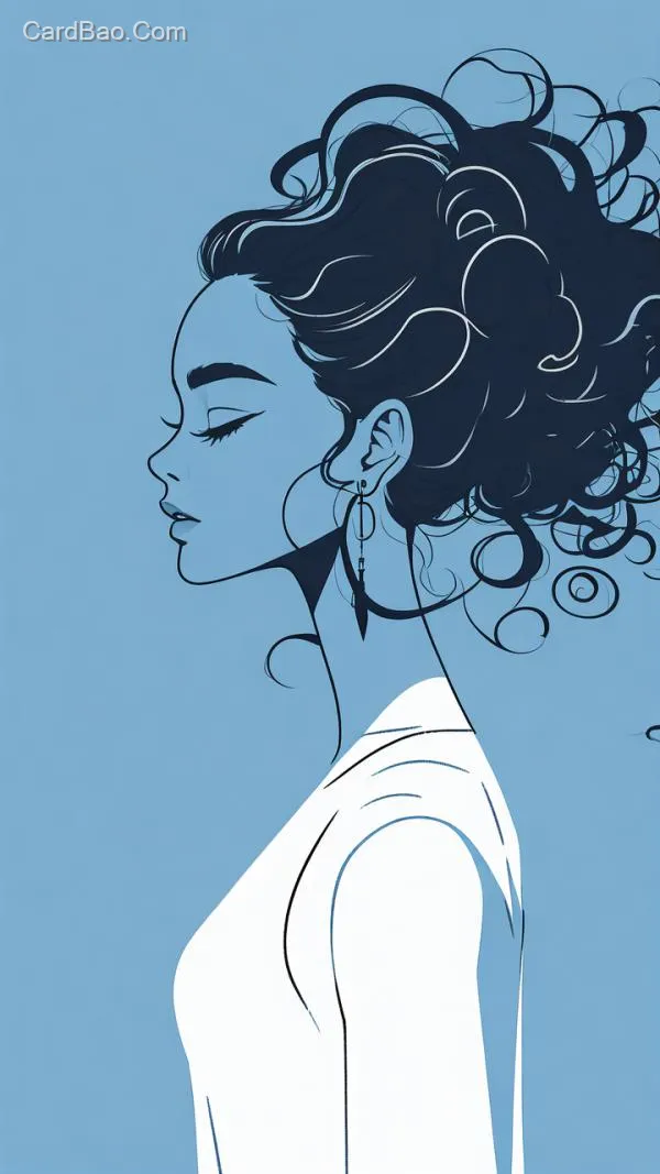 手绘插画风,极简,头像,宝蓝色背景,白色的人物剪影,卡通,少女侧脸,大波浪长卷发,线条