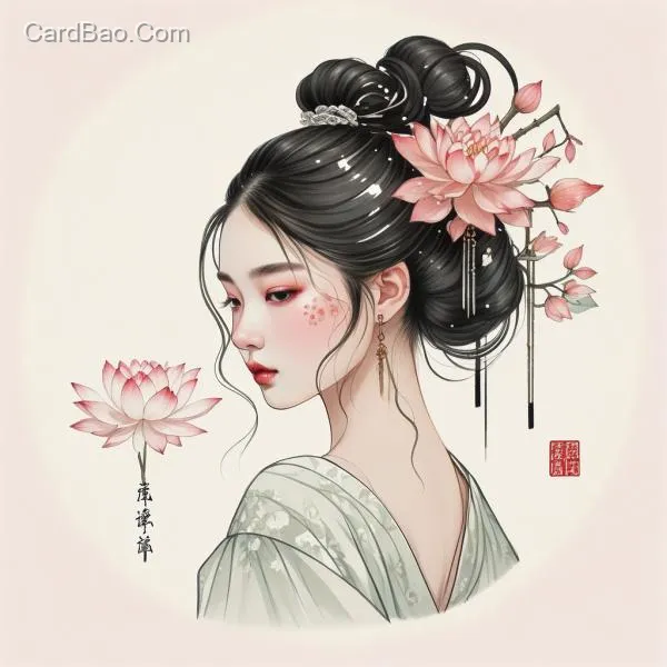 Oriental beauty avatar, elegance that outshines the past and present, lotus flowers shy before her jade-like complexion, minimalist cartoon style.