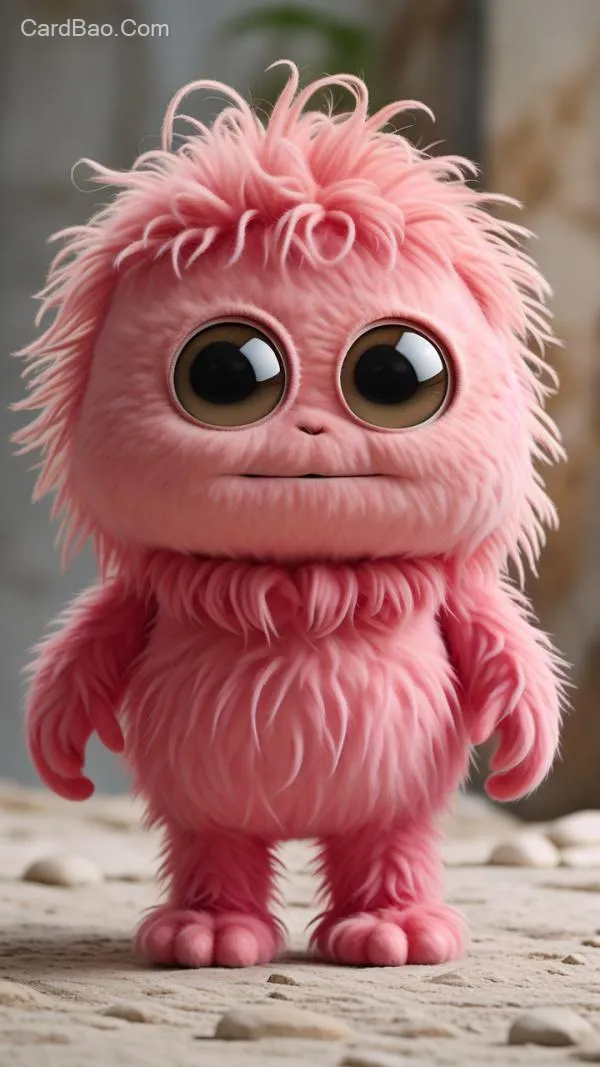 A cute little pink monster with a fluffy texture, covered all over in soft, long fur that reveals only two eyes. It has a round, chubby body without a visible neck, exuding sweetness and adorableness. Rendered in 3D, full-body shot, natural lighting.