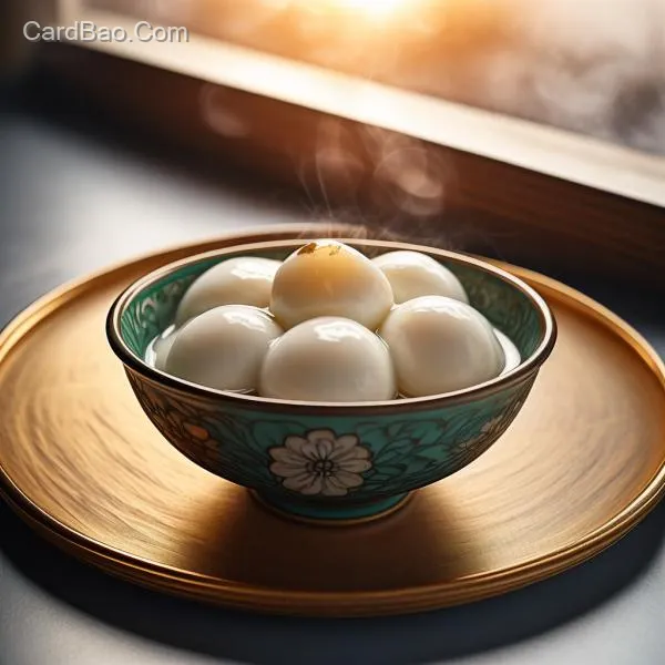 黄金托盘上有一个翡翠碗,里面盛有元宵,元宵上写有“元宵节快乐”的字
