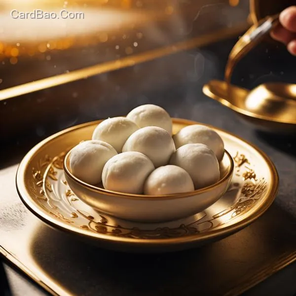 黄金托盘上有一碗元宵,元宵上写有“元宵节快乐”的字