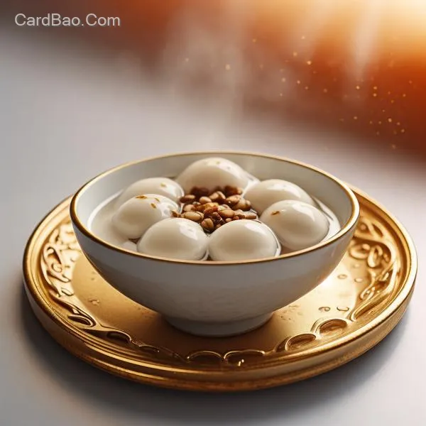 黄金托盘上有一碗元宵,元宵上写有“元宵节快乐”的字